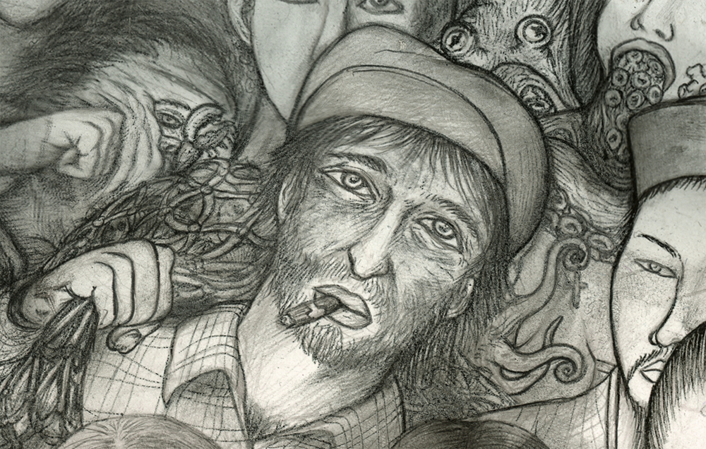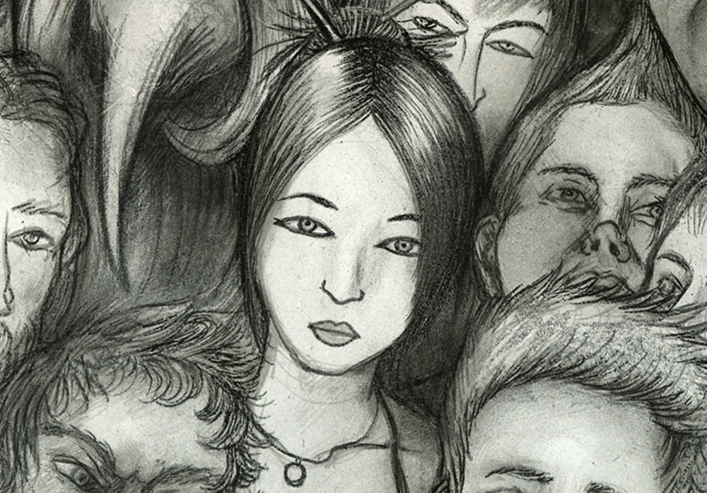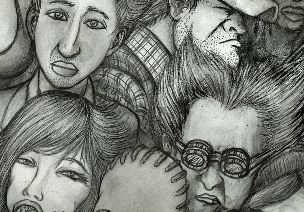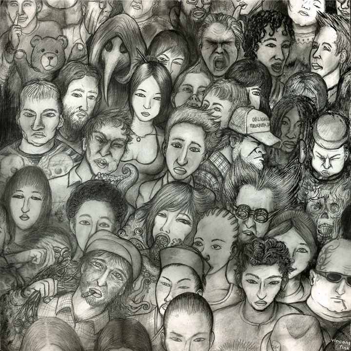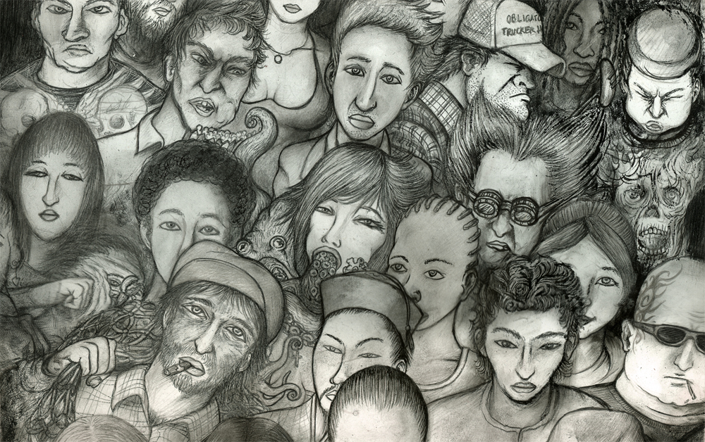Crowded 1 has been sitting around since thanksgiving when I drew the 1st couple faces. Kept pokin’ around at it and remembered that drawing a crowd of detailed little faces takes a lot of patience. I like to give them characteristics that tell a story about where they’ve been and maybe where they’re going…