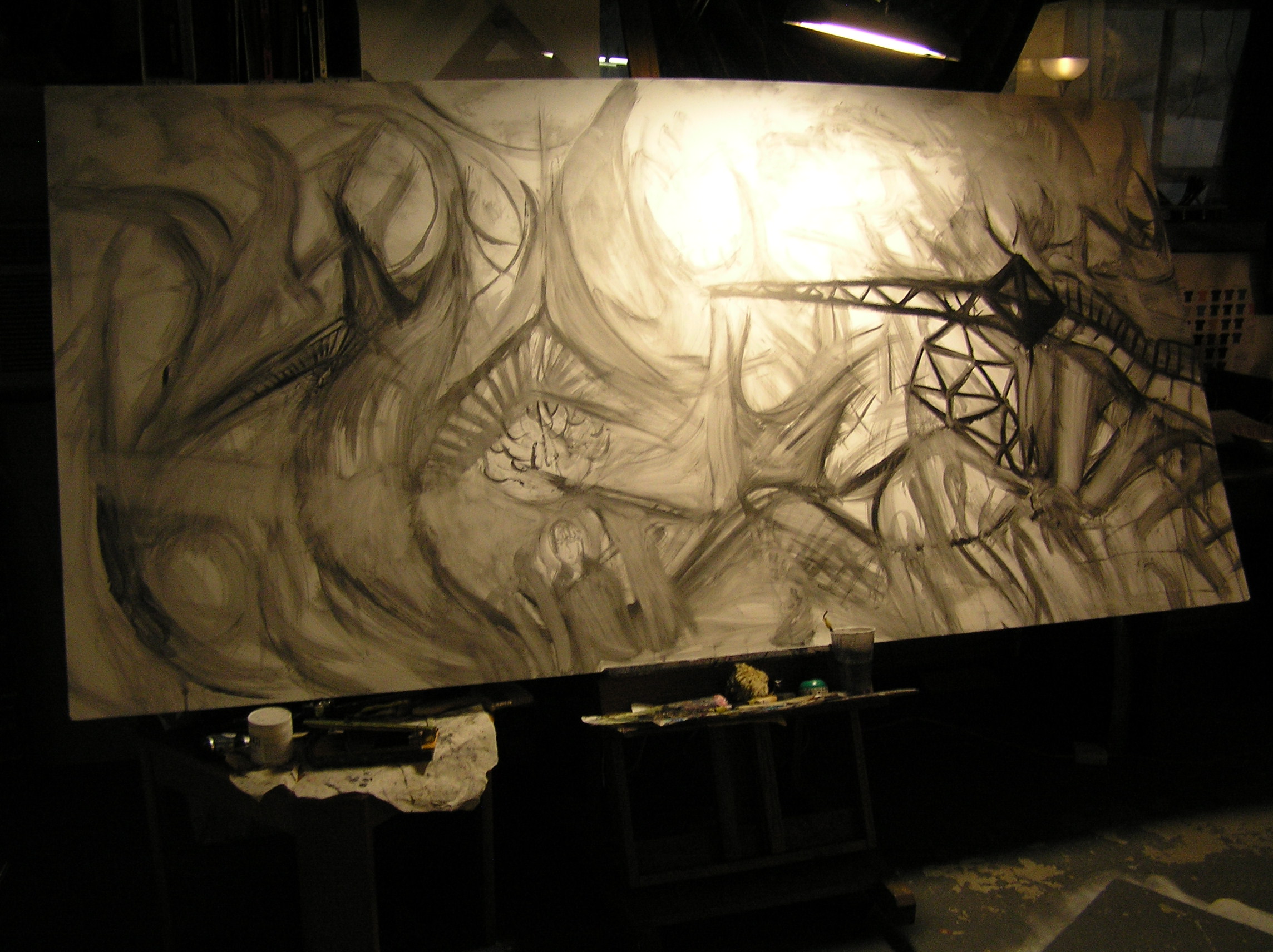 This 4 ft x 8 ft sumi ink on board is the largest project I’ve ever taken on and I plan on it being my best piece. It’s so big it’s hard to move around! I can only work on it in between the custom art I’m churning out, so it’s gotten only a handful of sessions in it so far. Seeking more gallery representation for works like this.