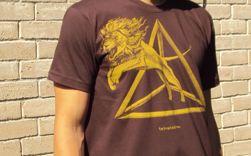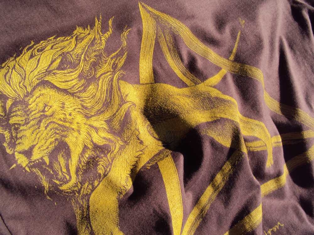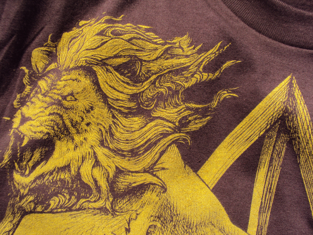 Printed on 100% cotton American Apparel unisex brown t-shirts with light coverage of yellow/gold ink. Made in the U.S.A.