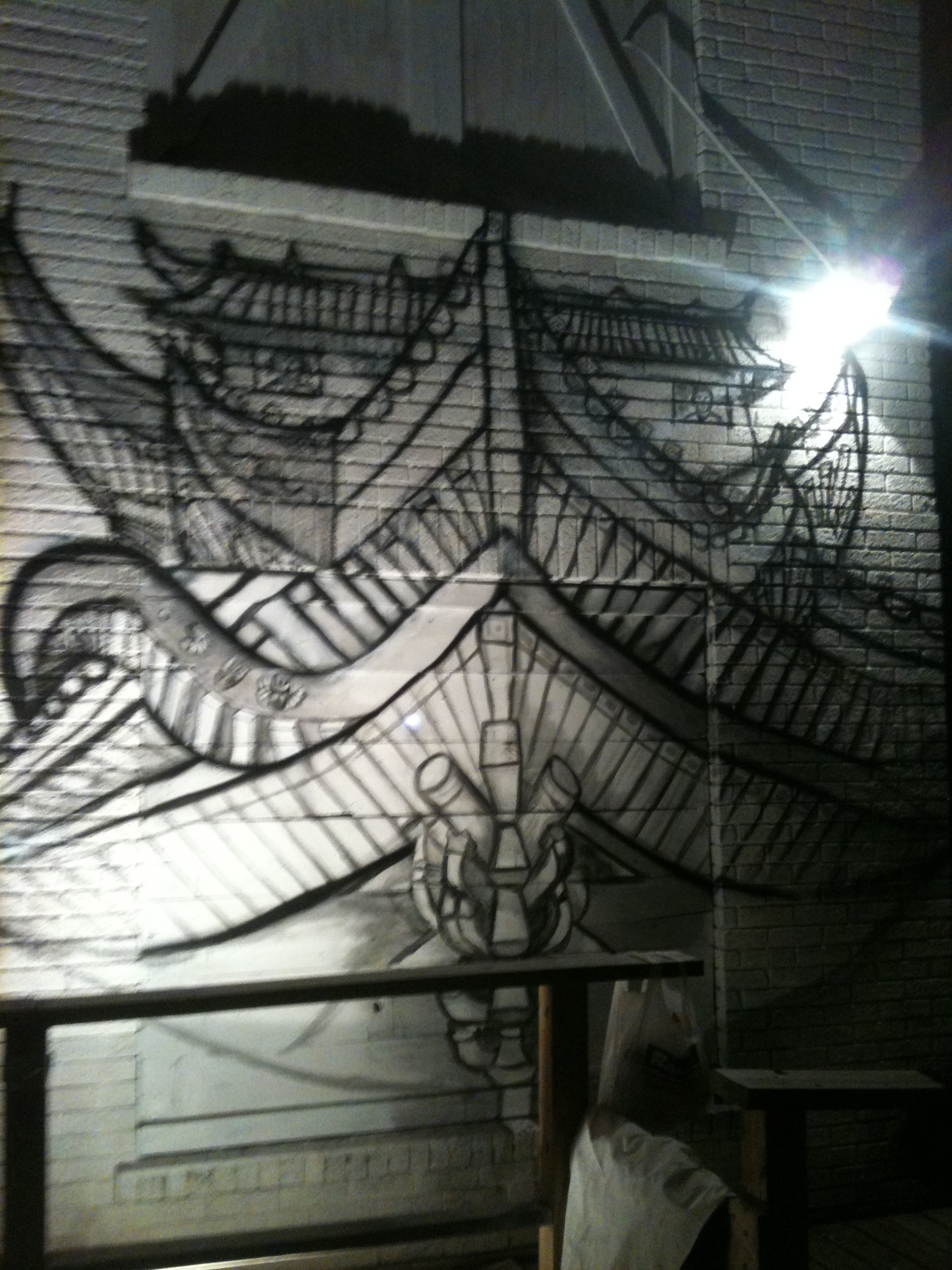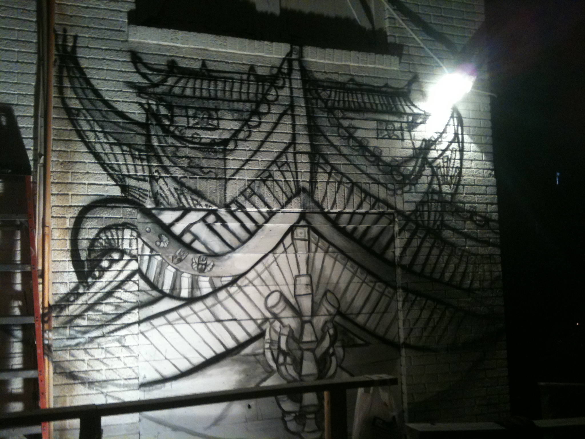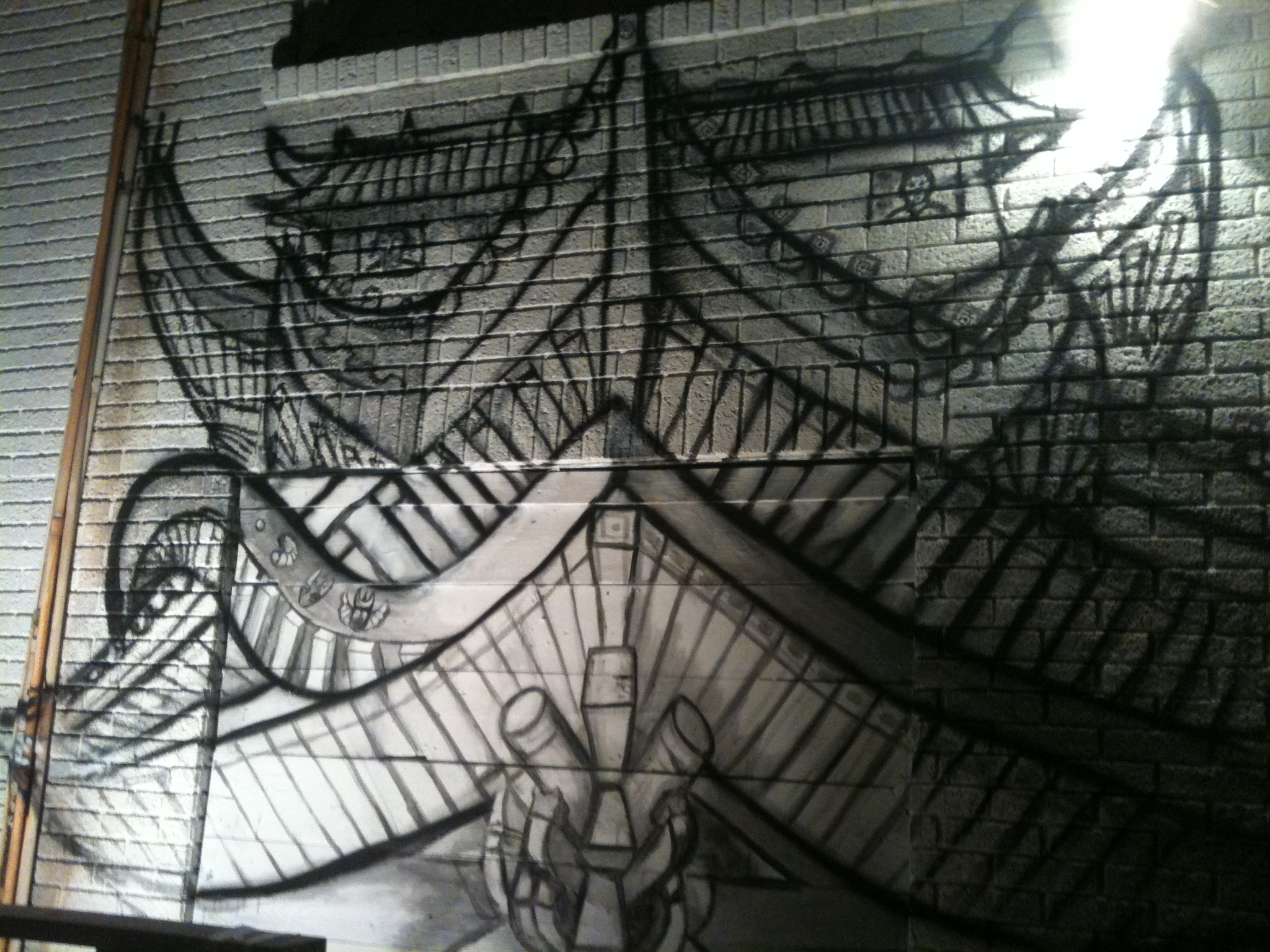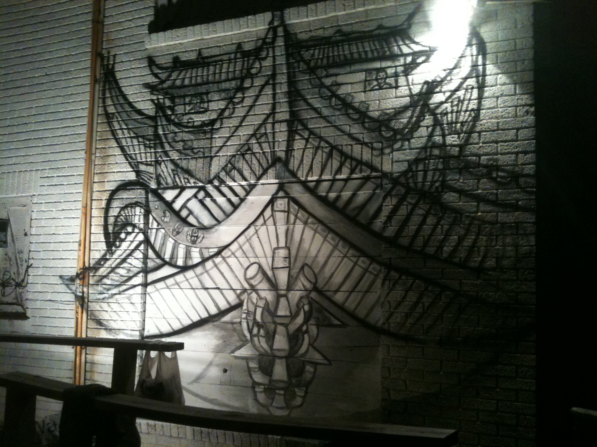 My 1st design (the grayscale pagoda or asian architecture) is a real challenge cause it’s on mostly bumpy bricks that nothing can penetrate with a smooth line other than spray, which I’m very new to this and should have maybe considered that before chosing my subject matter. My idea would have worked very easily on smooth surface like the coloured egyptian King Pupa at Montrose Proper.