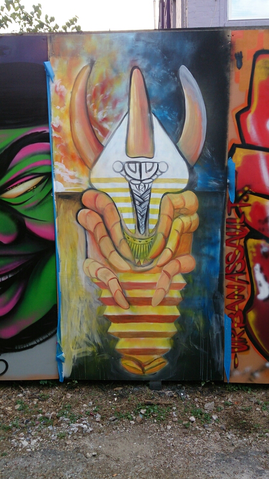 So other than a stencil and a few thousand stickers, here’s my 1st public art pieces in progress. Both kinda just going off of my usual imagery. I have been experimenting with both brush and spray cans and learning a lot about both on this large scale.