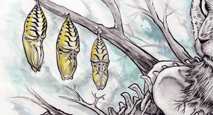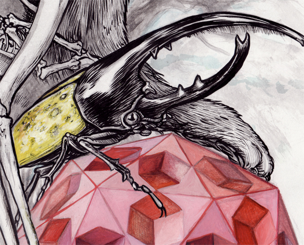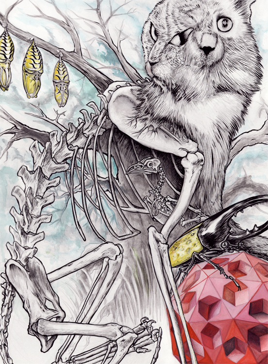 Siamese Twin Cats with skeleton exposed, tree limbs, pupating moths, bird skeleton, Hercules Beetle sitting on dodecahedron…I’m not sure the exact modification name, but it’s pretty fancy.
