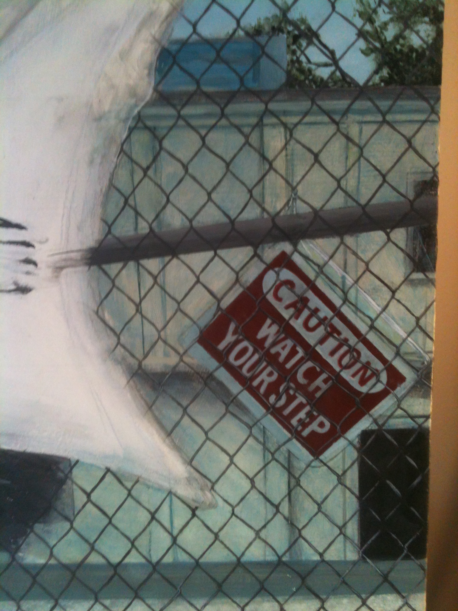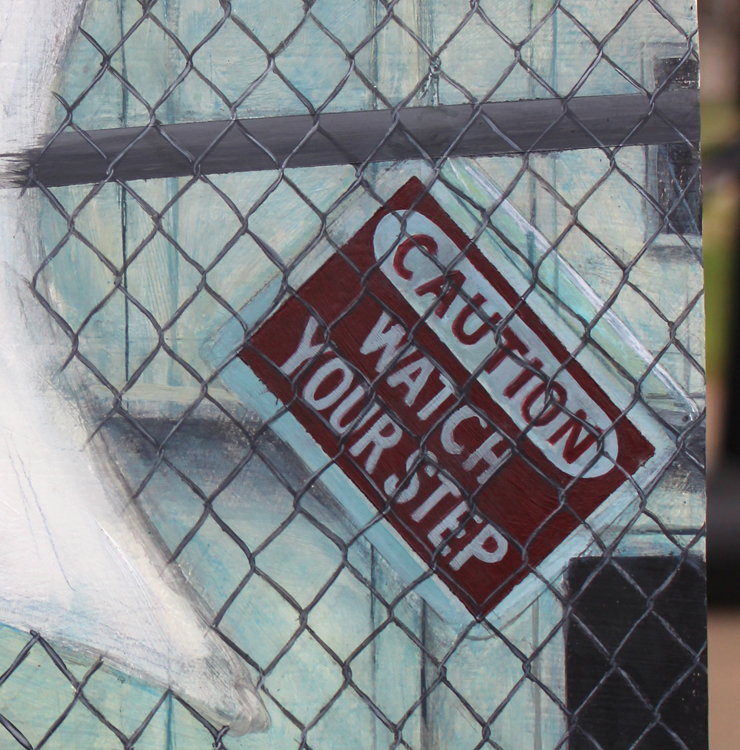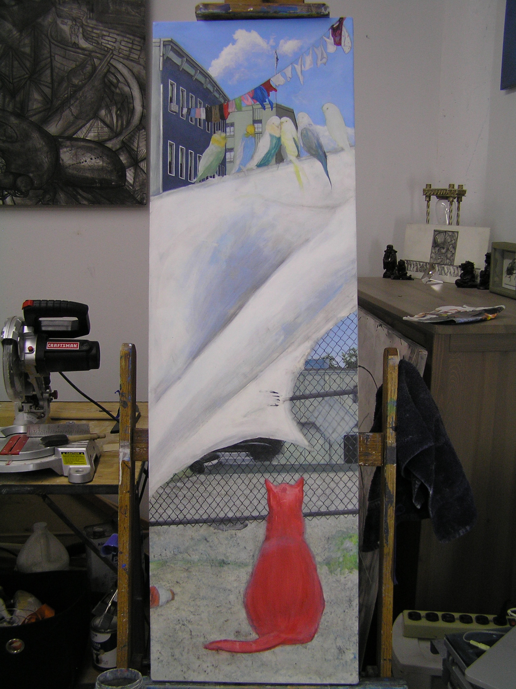 I used some photos I took in New York around Queens last time I was there for the buildings in this piece. I also learned that chain linked fences are a bitch to paint along with precise typography, apartment buildings, parakeets, and clothes lines. It’s getting redonckulous on this panel… finally about to do the foreground and be done!